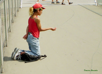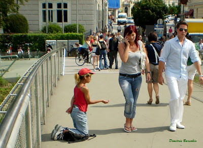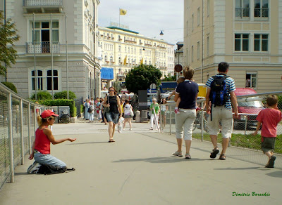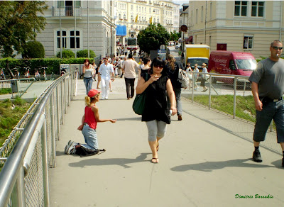 Έβγαλα αυτές τις φωτογραφίες την Τρίτη 14 Ιουλίου 2009 στη γέφυρα Makartsteg του ποταμού Salzach, ο οποίος διασχίζει το κεντρικό τμήμα της πόλης του Salzburg. Έχοντας εντυπωσιαστεί από το μεγαλοπρεπές Schloss Mirabell και τους μαγευτικούς κήπους του, κατευθυνόμουν προς την άλλη όχθη του ποταμού, για να επισκεφτώ το σπίτι (μουσείο) όπου γεννήθηκε ο Mozart. Κι εκεί, στη μέση της γέφυρας, είδα το κοριτσάκι να επαιτεί γονατιστό, ώρες ακίνητο σαν άγαλμα και χωρίς έκφραση στο πρόσωπο, ή μάλλον χωρίς πρόσωπο...